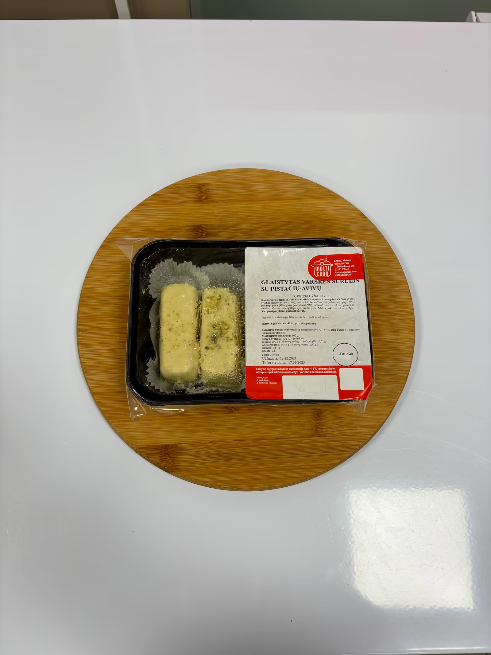 Sudedamosios dalys: varškės masė (38%), itin pasterizuota grietinėlė 30% (15%), šviežios šaldytos avietės (13%), baltasis šokoladas (7%), baltojo šokolado glajus (7%), pistacijų pasta (3%), pistacijos riešutai (2%), baltasis kristalinis cukrus, geriamasis vanduo, rafinuotas saulėgrąžų aliejus, vanilės pasta, želatina, pektinas, citrinų sultys. Alergenai paryškinti pusjuodžiu šriftu.