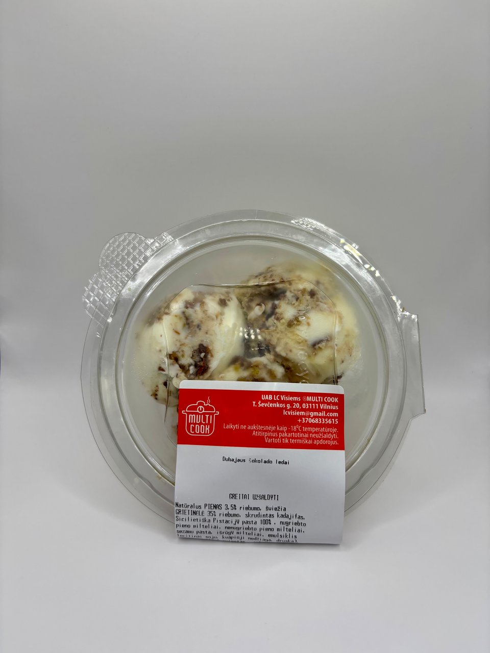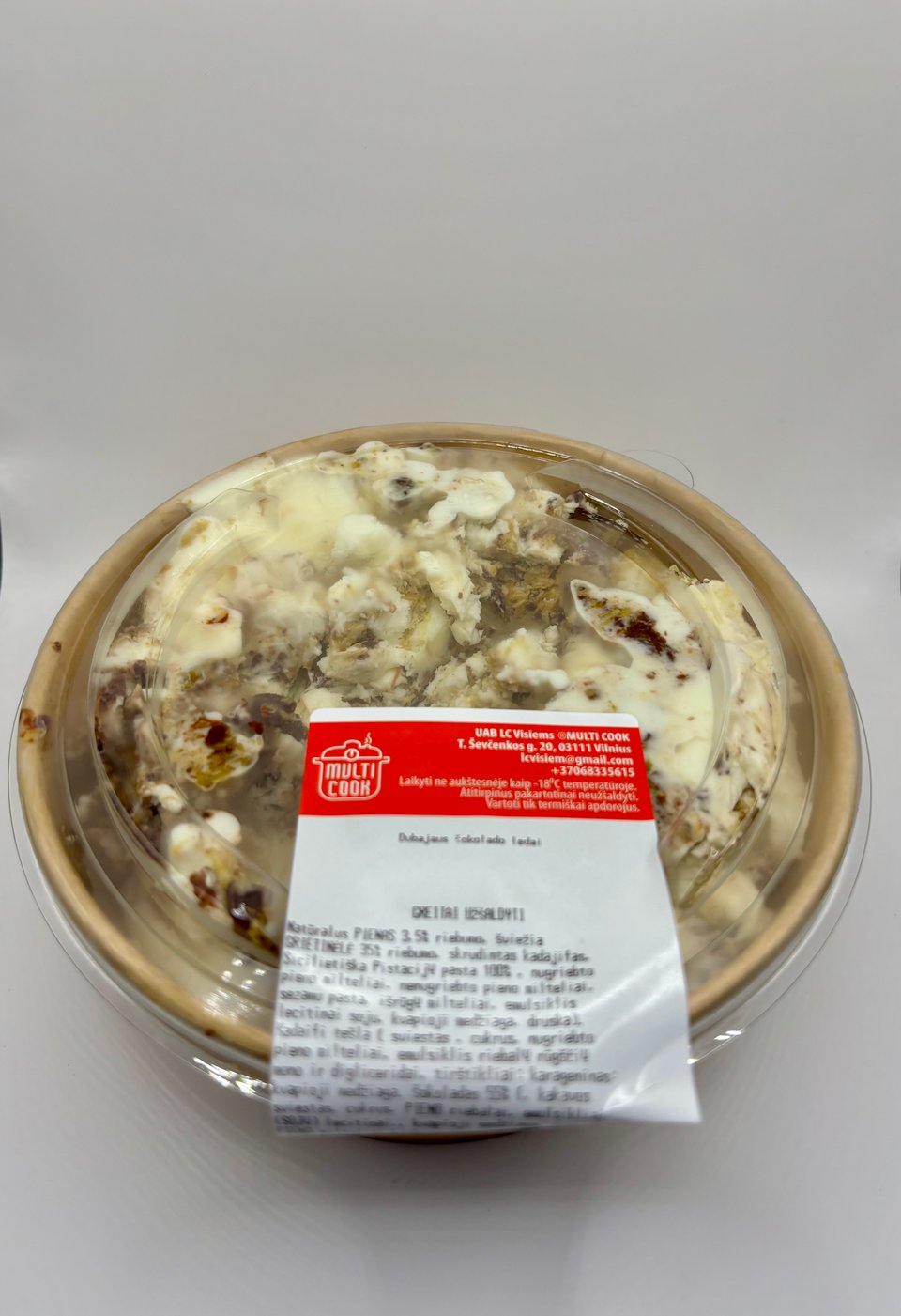 Natūralus PIENAS 3,5% riebumo, šviežia GRIETINĖLĖ 35% riebumo, skrudintas kadajifas, Sicilietiška Pistacijų pasta 100%, nugriebto PIENO milteliai, nenugriebto PIENO milteliai, sezamų pasta, išrūgų milteliai, emulsiklis lecitinai sojų, kvapioji medžiaga, druska). Kadaifi tešla (sviestas, cukrus, nugriebto PIENO milteliai, emulsiklis riebalų rūgščių mono ir digliceridai, tirštikliai: karageninas; kvapioji medžiaga). Šokoladas 55% (kakavos sviestas, cukrus, PIENO riebalai, emulsikliai (SOJŲ) lecitinai, kvapioji medžiaga, nugriebto PIENO milteliai). Laikymo temperatūra: nuo -18°C.
