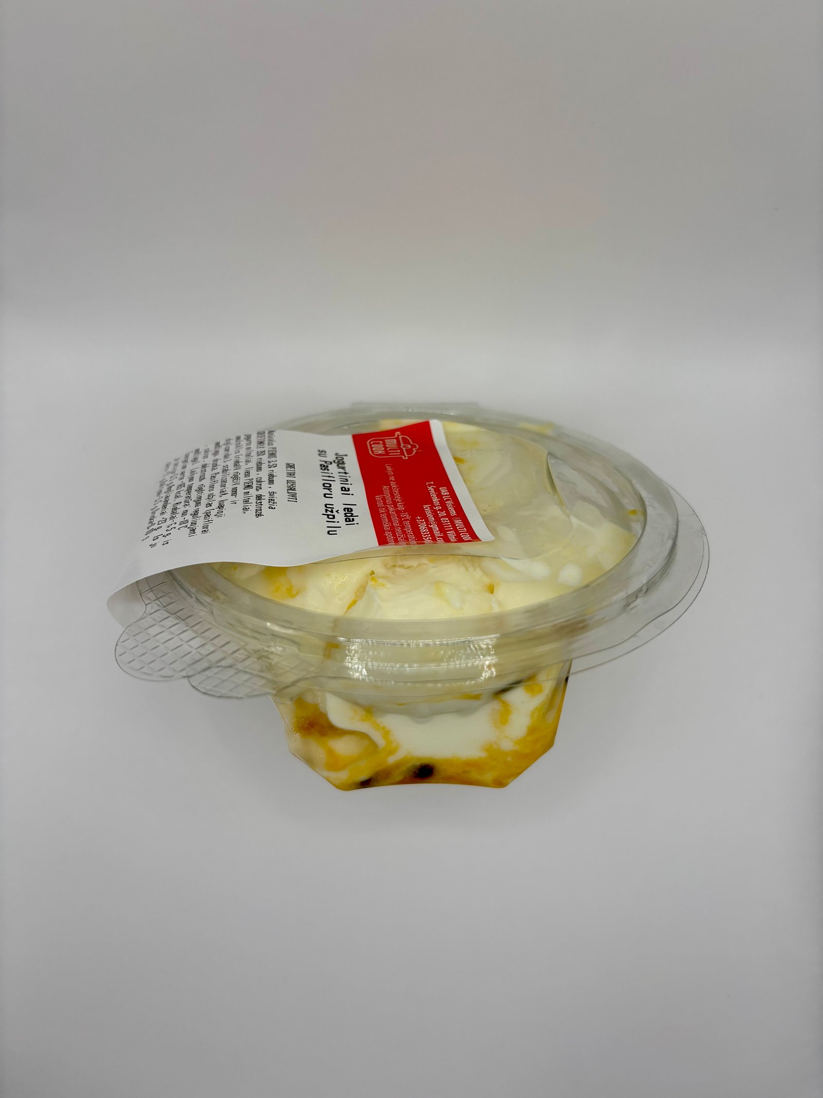 Natūralus PIENAS 3,5% riebumo, šviežia GRIETINĖLĖ 35% riebumo, cukrus, dekstrozė, jogurto milteliai, lieso PIENO milteliai, emulsiklis (riebalų rūgščių mono- ir digliceridai), stabilizatoriai*, kvapioji medžiaga, druska. Pasifloru užpilas (pasiflorai, cukrus, dekstrozė, rūgštinguma reguliuojanti medžiaga). Laikymo temperatūra: nuo -18°C