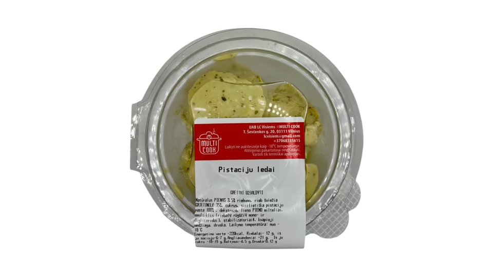 Natūralus PIENAS 3,5% riebumo, rieb šviežia GRIETINĖLĖ 35%, cukrus, sicilietiška pistacijų pasta 100%, dekstrozė, lieso PIENO milteliai, emulsiklis (riebalų rūgščių mono- ir digliceridai), stabilizatoriai*, kvapioji medžiaga, druska. Laikymo temperatūra: nuo -18°C