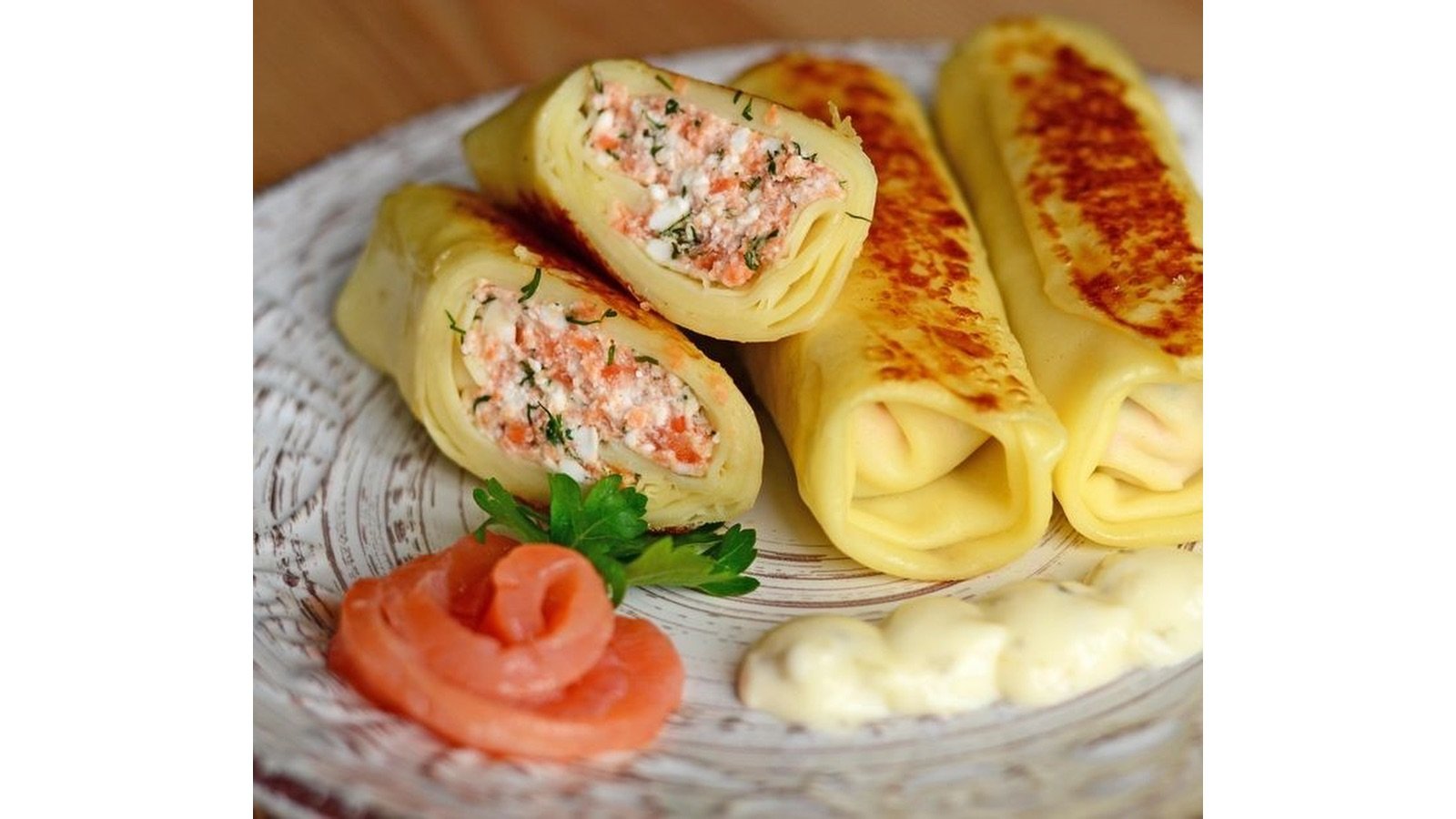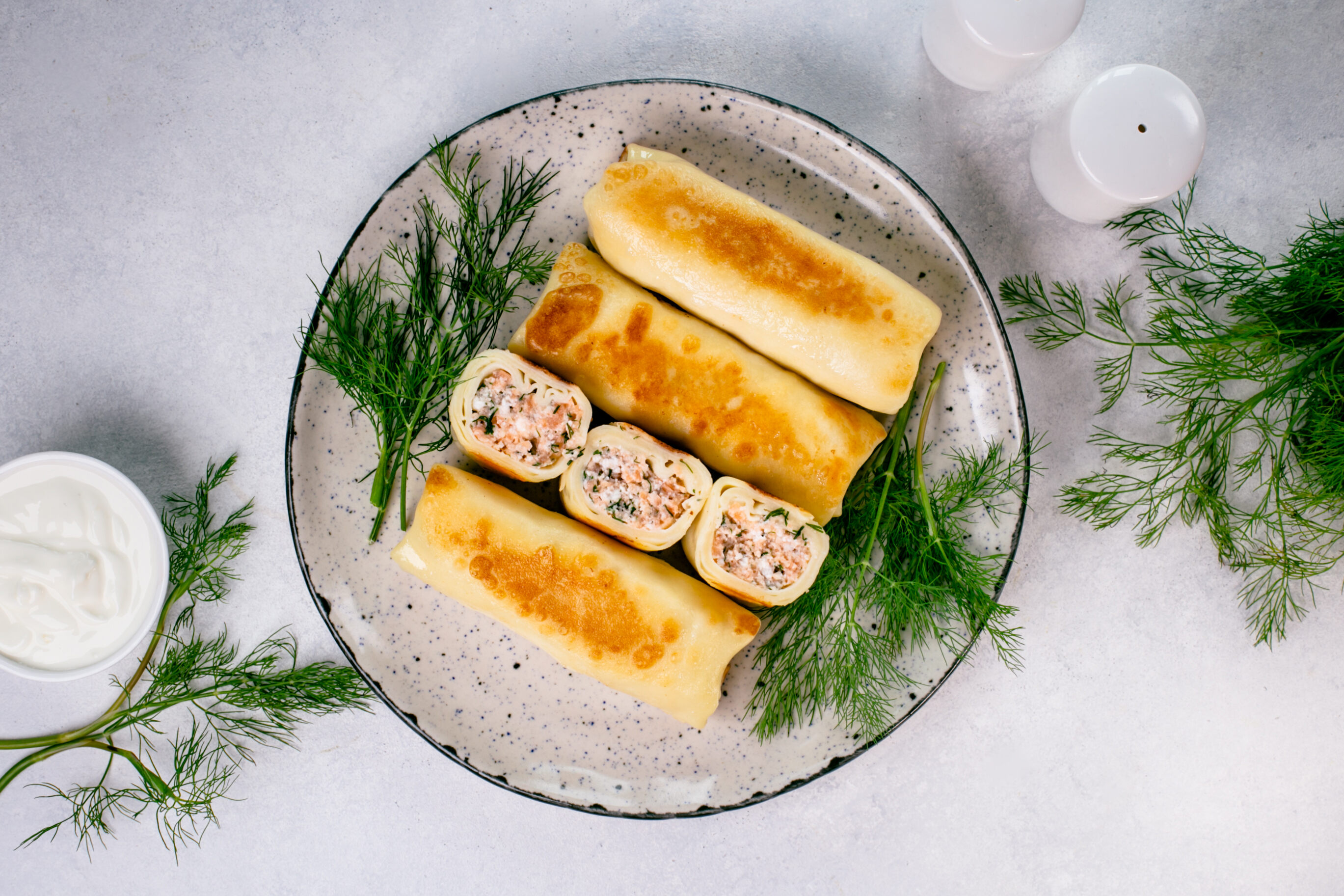 Sudedamosios dalys: lietinis blynas (58%) (pienas, aukščiausios rūšies kvietiniai miltai, kiaušiniai, vanduo, sviestas, cukrus, druska), įdaras (42%) (lašiša (56%), 9% riebumo varškė (38%), krapai).