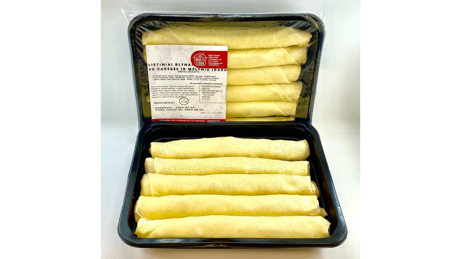 Sudedamosios dalys: lietinis blynas (58%) (pienas, aukščiausios rūšies kvietiniai miltai, kiaušiniai, vanduo, sviestas, cukrus, druska), įdaras (42%) (9% riebumo varškė (70%), mėlynės (21%), cukrus).