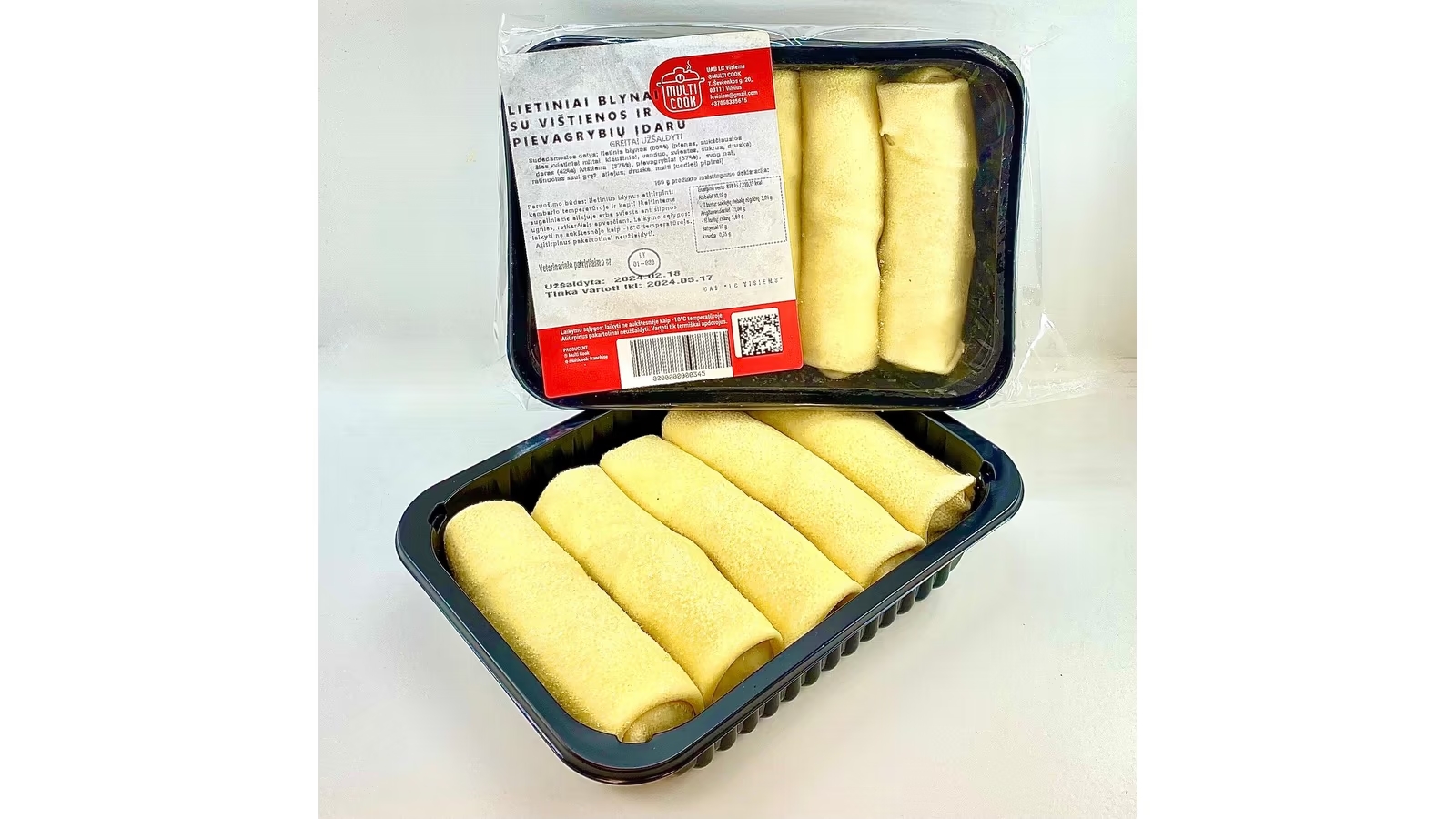 Sudedamosios dalys: lietinis blynas (58%) (pienas, aukščiausios rūšies kvietiniai miltai, kiaušiniai, vanduo, sviestas, cukrus, druska), įdaras (42%) (vištiena (37%), pievagrybiai (37%), svogūnai, rafinuotas saulėgrąžų aliejus, druska, malti juodieji pipirai).