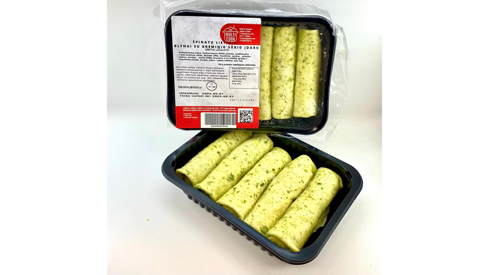 Sudedamosios dalys: lietinis blynas (66%) (pienas, aukščiausios rūšies kvietiniai miltai, špinatai (5%), kiaušiniai, vanduo, sviestas, cukrus, druska), įdaras (34%) (kreminis sūris (100%) (grietinėlė, nugriebtas pienas, druska, pieno rūgšties bakterijų kultūros)).