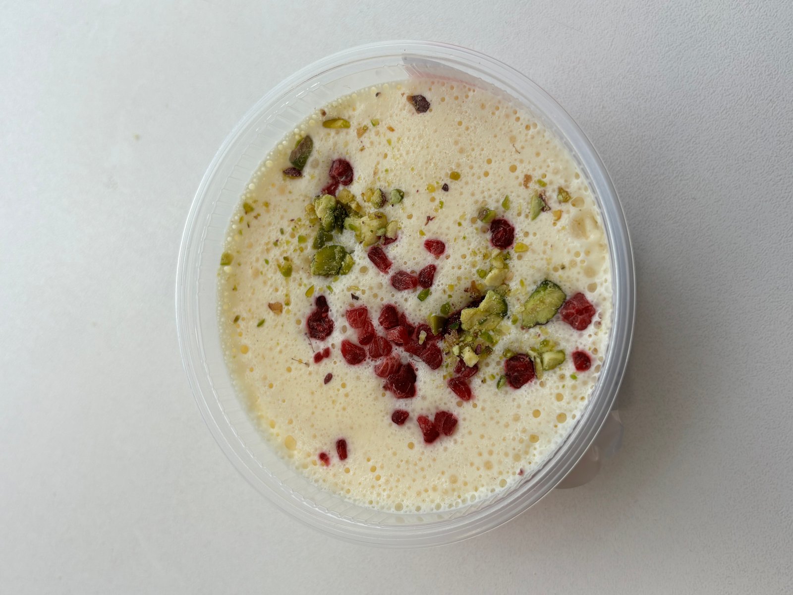 Sudedamosios dalys: maskarponė (29%), grietinėlė 30% (23%), pienas 2,5% (12%), avietės (12%), vištienos kiaušiniai (6%), pistacijų riešutas (6%), baltasis kristalinis cukrus, vanilės pasta.