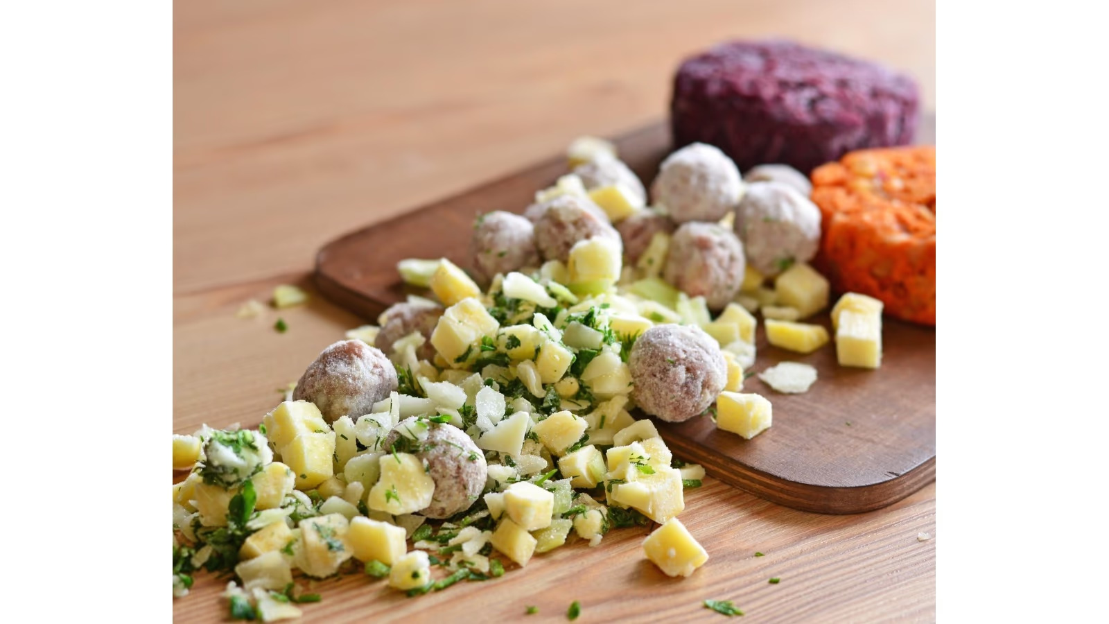 Sudedamosios dalys: bulvės (30%), burokėlių mišinys (20%) (burokėliai, cukrus, rafinuotas saulėgrąžų aliejus, 9% actas, druska), kopūstai, morkų mišinys (morkos, svogūnai, paprika, pomidorų pasta, rafinuotas saulėgrąžų aliejus, prieskoniai), kiaulienos frikadelės (15%) (kiauliena, kiaulienos lašiniai, kiaušiniai, svogūnai, druska, malti juodieji pipirai), krapai, petražolės.