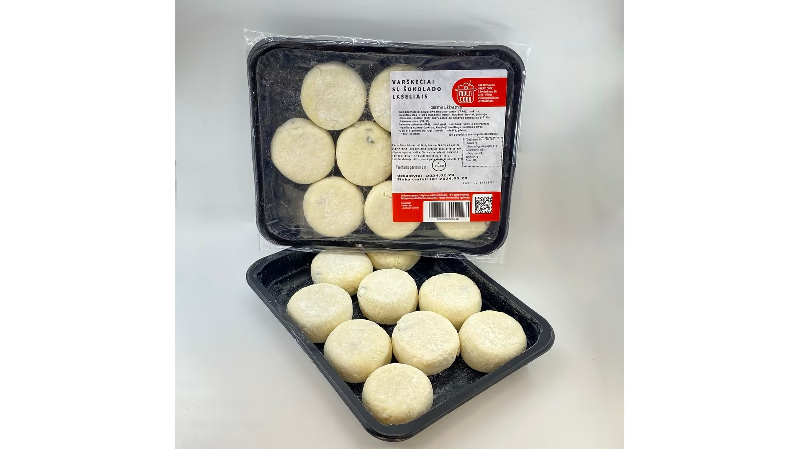 Sudedamosios dalys: 9% riebumo varškė (71%), cukrus, aukščiausios rūšies kvietiniai miltai, kiaušinių tryniai, juodojo šokolado lašeliai (4%) (cukrus, riebios kakavos sausosios (17 %), kakavos masė (39 %), kakavos sviestas (6%), saulėgrąžų, lecitinas, vanilės ekstraktas), vanilinis cukrus (cukrus, kvapioji medžiaga vanilinas 3%).