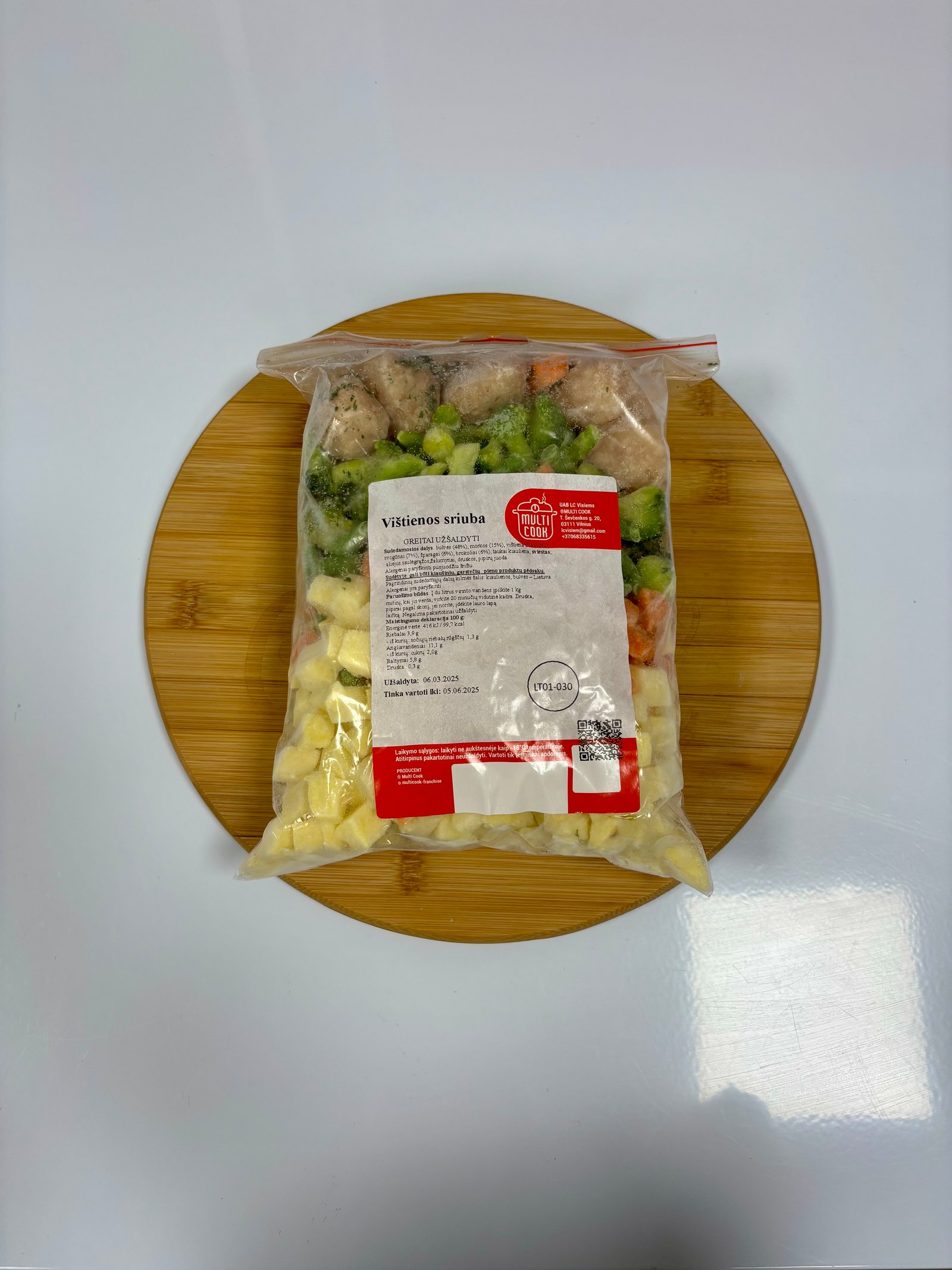 Sudedamosios dalys: bulvės (48%), morkos (15%), vištiena filė (10%), svogūnai (7%), šparagai (6%), brokoliai (6%), taukai kiauliena, sviestas, aliejus saulėgrąžos, žalumynai, druskos, pipirų juoda.